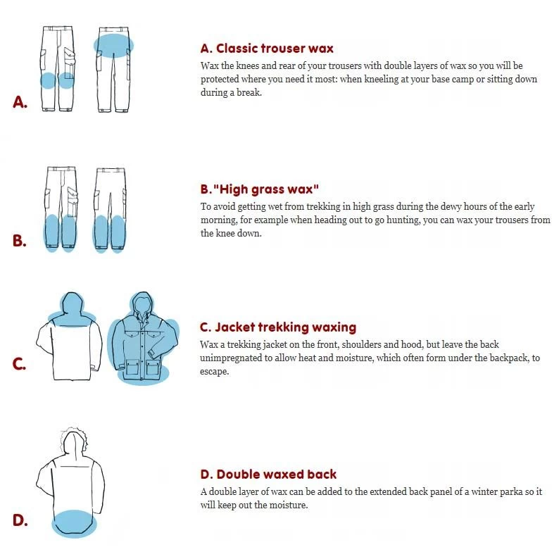 Unlike standard water-proofers which are added to your washing machine – thus affecting your entire garment – Greenland Wax allows you to truly adapt your garment’s performance to your personal preferences. For example, extra protection can be added to the knees and seat of your trousers where they are more likely to come into contact with wet ground, while leaving the rest of the garment wax-free and more breathable. A number of common applications can be seen in the guide above.