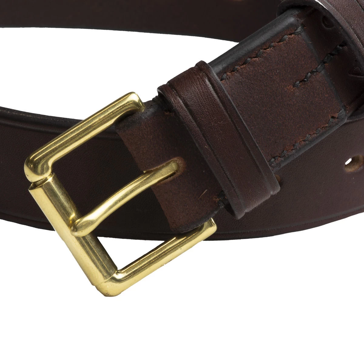 The vegetable tanned leather is hand-dyed to Woodlore’s Rich Brown colour and shows all the beauty of its full natural grain which is further brought out by the dark brown hand burnished, bevelled edges and traditional crease lines. Three rows of hand-stitching using a braided polyester thread secure the heavyweight, solid brass buckle with roller and two leather loops keep the free end of the belt in place; one fixed at the buckle and one free-running.